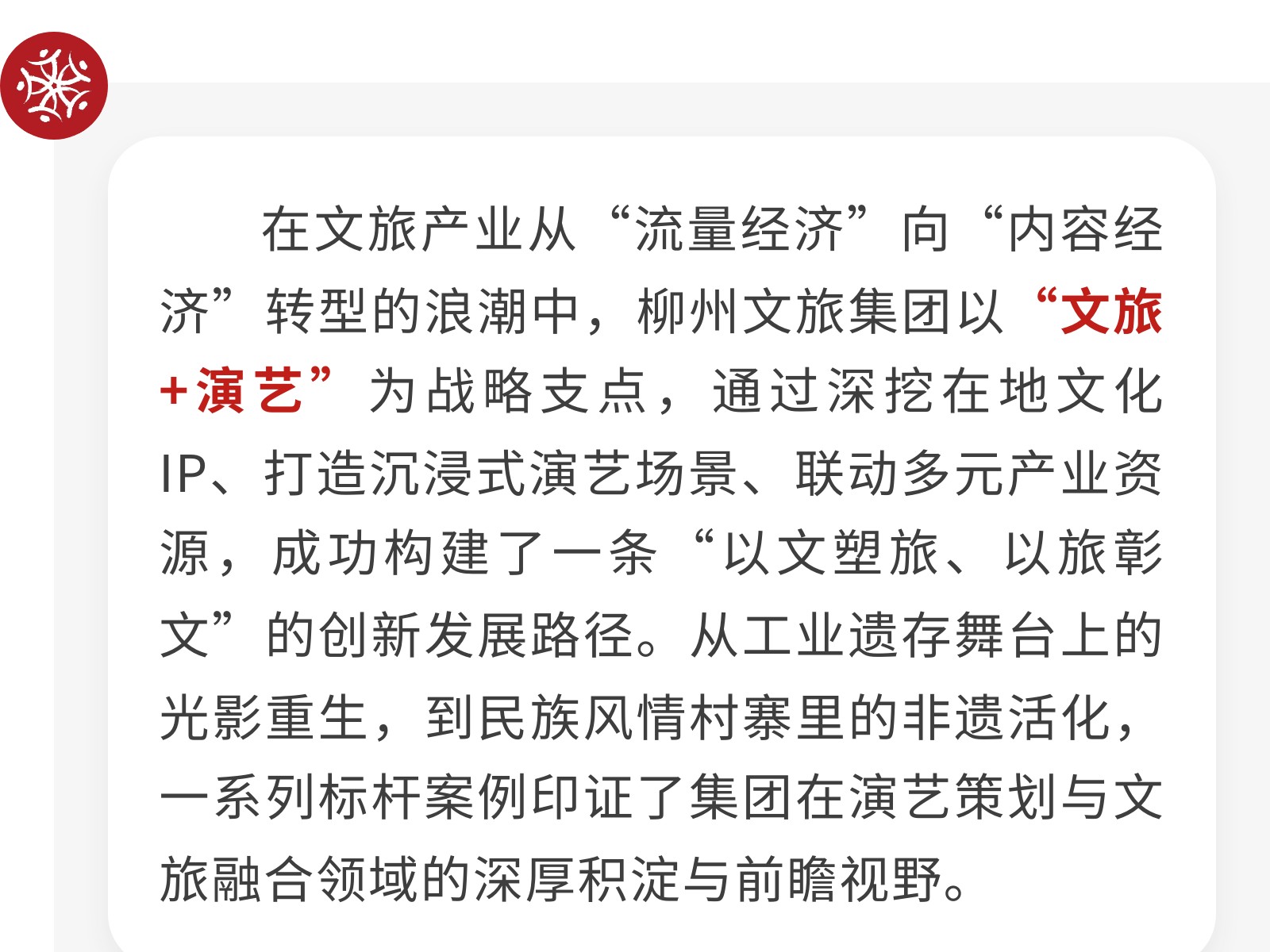 文旅融合新篇章:柳州文旅集團以演藝為媒,激活城市文化基因 發(fā)布時間:2025年09月26日 10時來源:本站原創(chuàng)瀏覽:72 人次