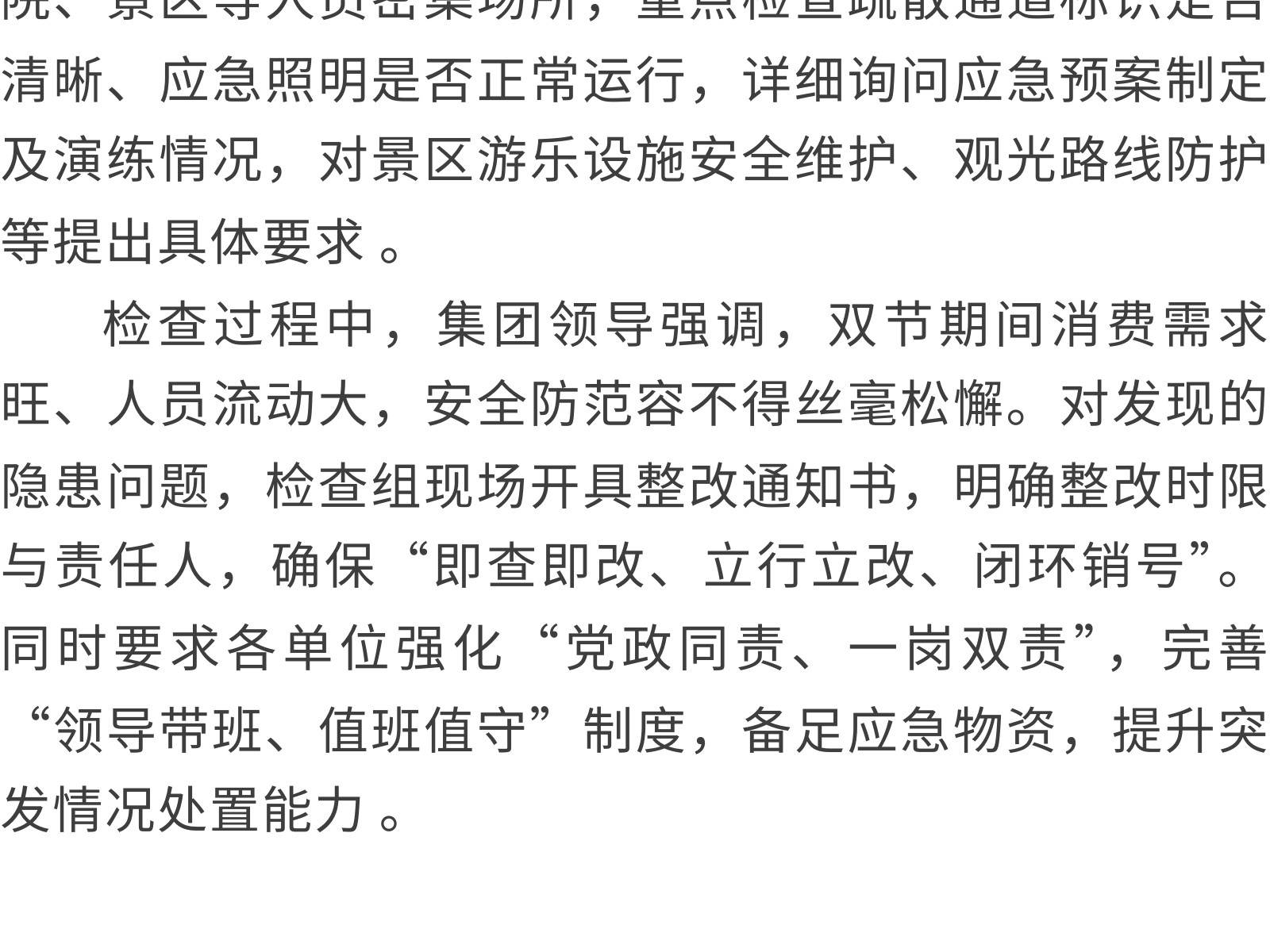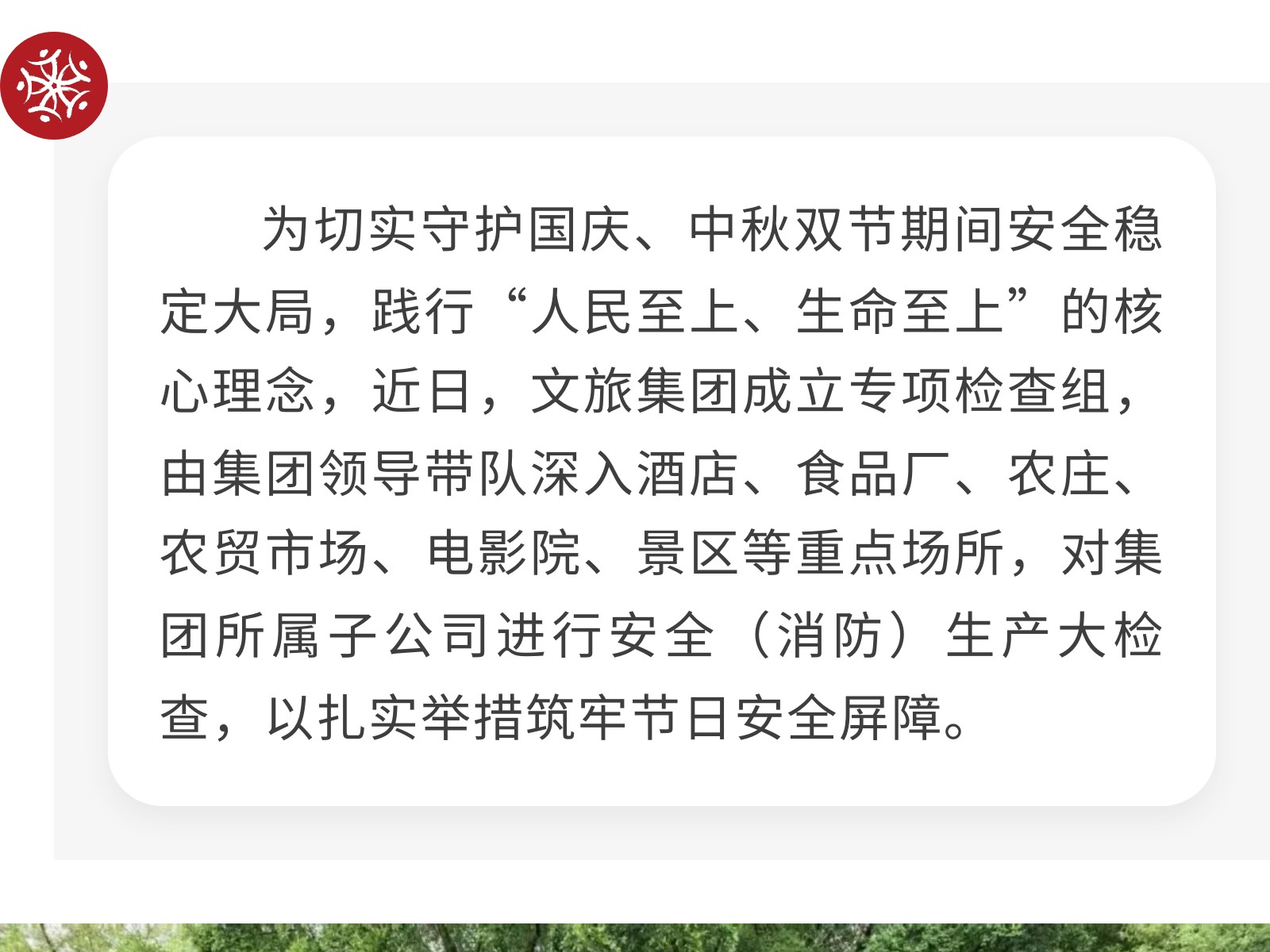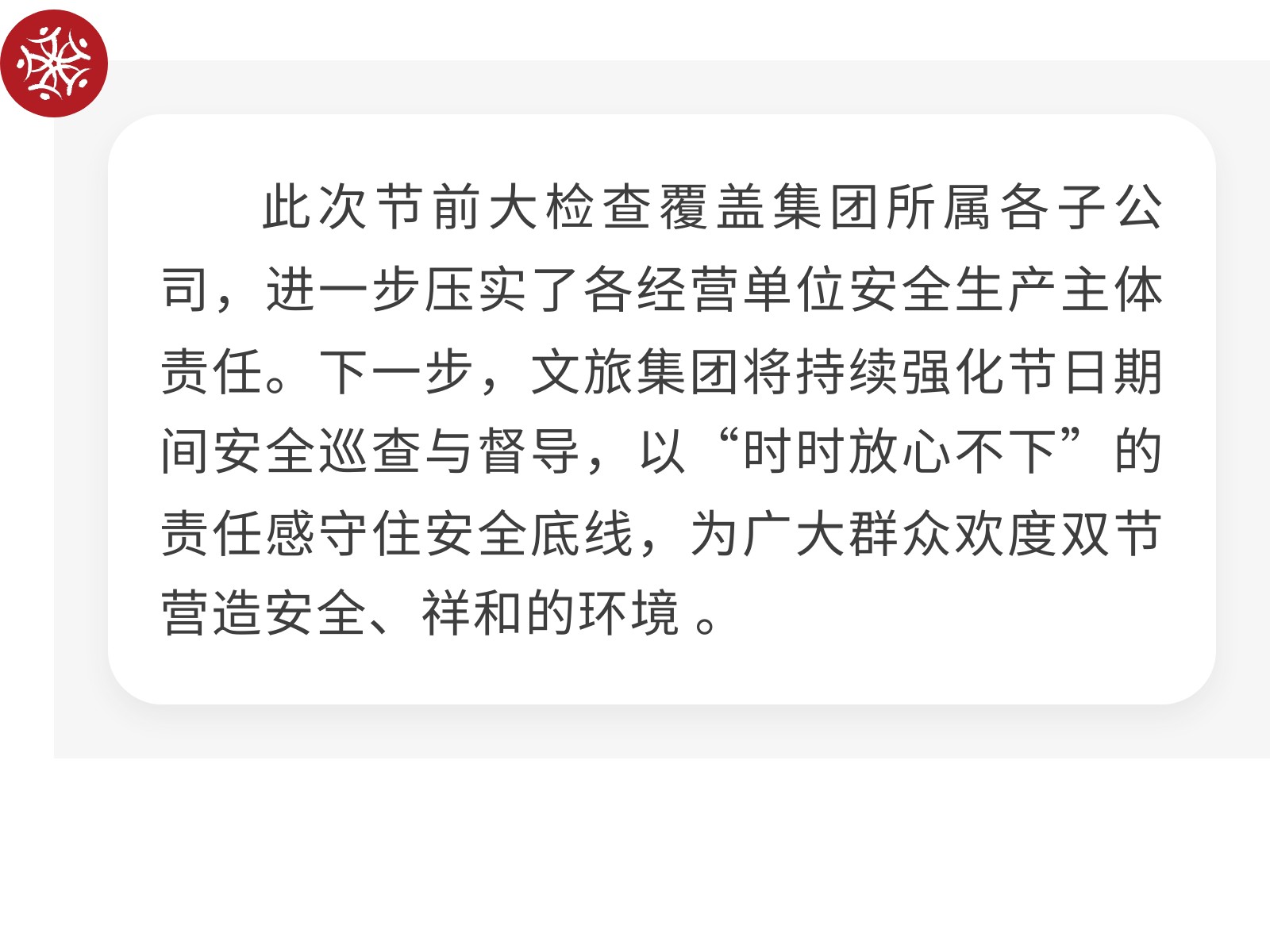 【筑牢安全防線 護(hù)航雙節(jié)安寧】文旅集團(tuán)開(kāi)展節(jié)前安全(消防)生產(chǎn)大檢查 發(fā)布時(shí)間:2025年09月30日 17時(shí)來(lái)源:本站原創(chuàng)瀏覽:81 人次