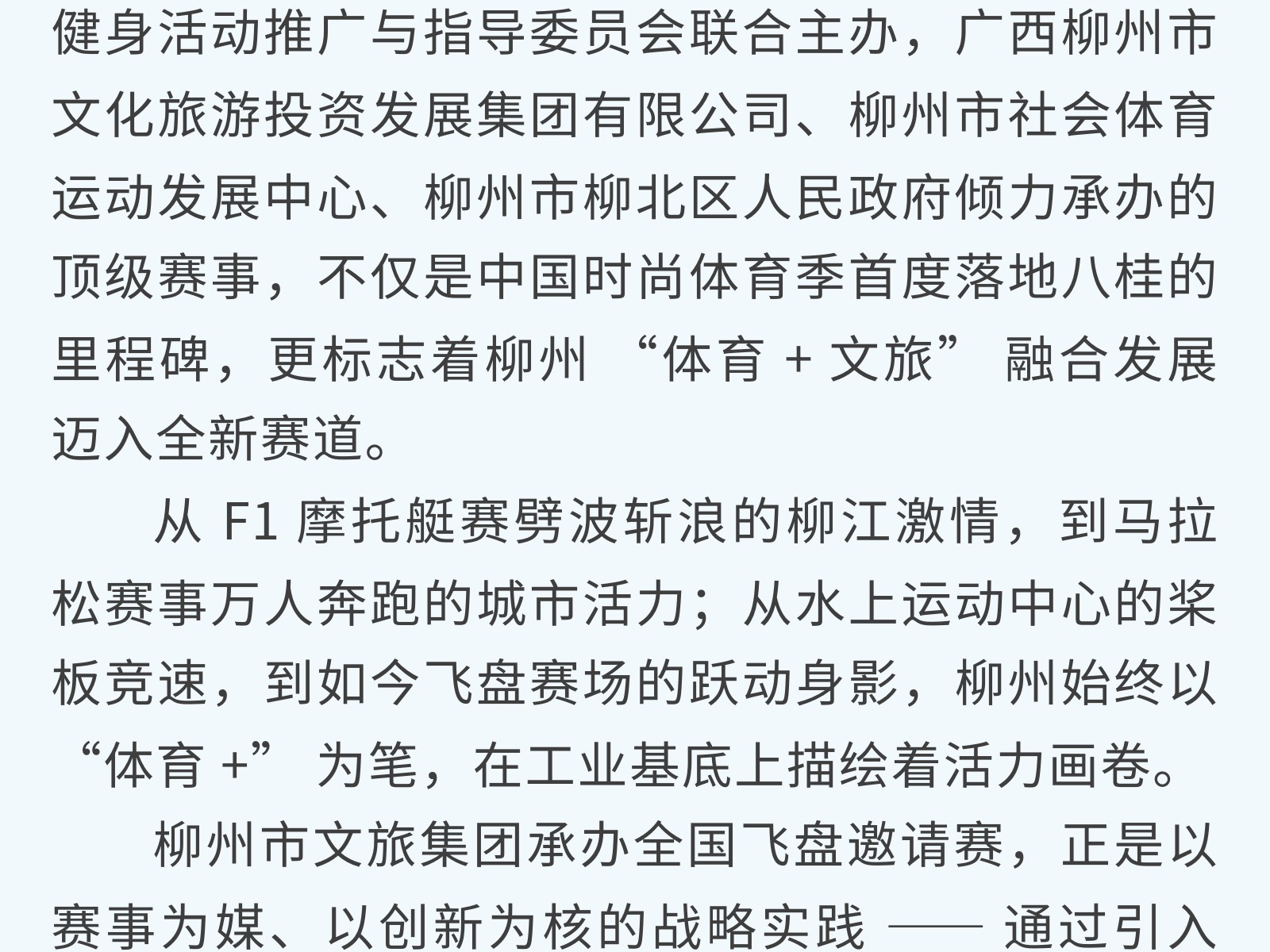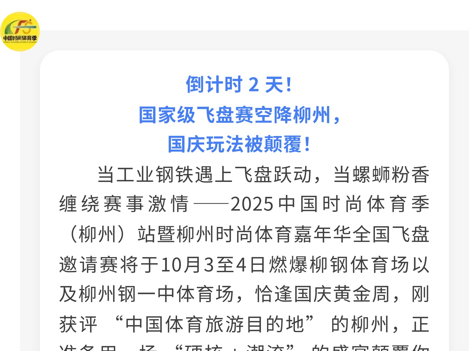 國慶赴柳!鋼鐵賽場飛盤燃,柳州這座體育旅游之城藏不住了 發(fā)布時間:2025年10月02日 17時來源:本站原創(chuàng)瀏覽:49 人次