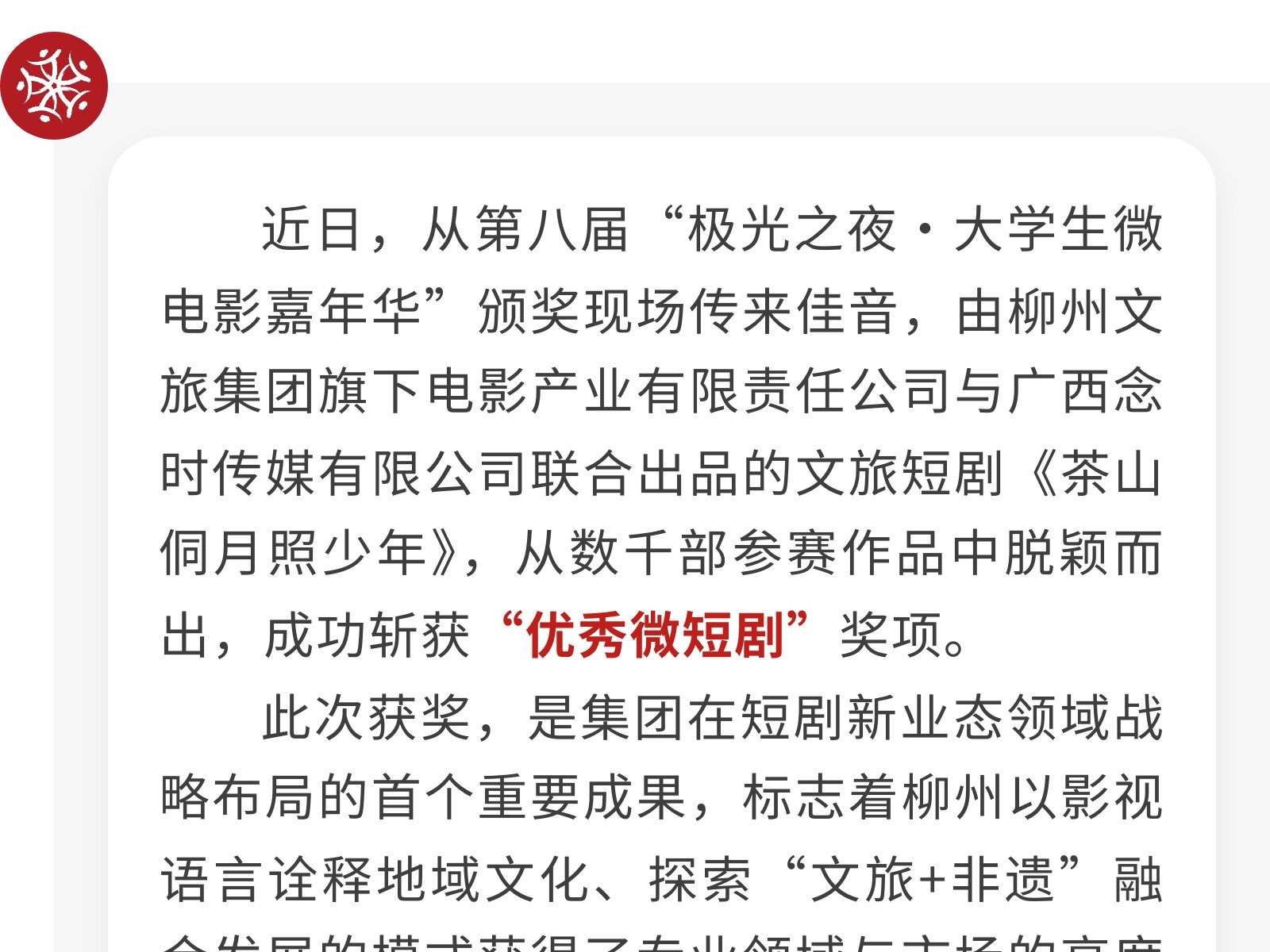 捷報!文旅集團電影公司出品短劇榮膺“極光之夜”優(yōu)秀微短劇獎 發(fā)布時間:2025年10月21日 10時來源:本站原創(chuàng)瀏覽:37 人次