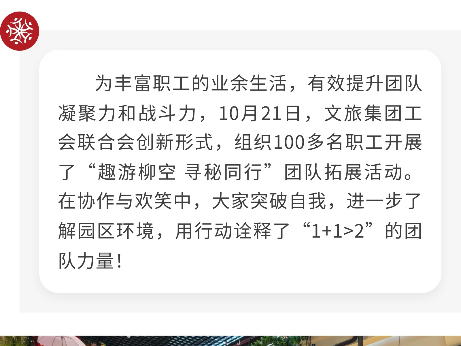 趣游柳空,尋秘同行!文旅集團(tuán)開展團(tuán)隊(duì)拓展活動(dòng),玩出滿滿凝聚力 發(fā)布時(shí)間:2025年10月23日 10時(shí)來源:本站原創(chuàng)瀏覽:35 人次