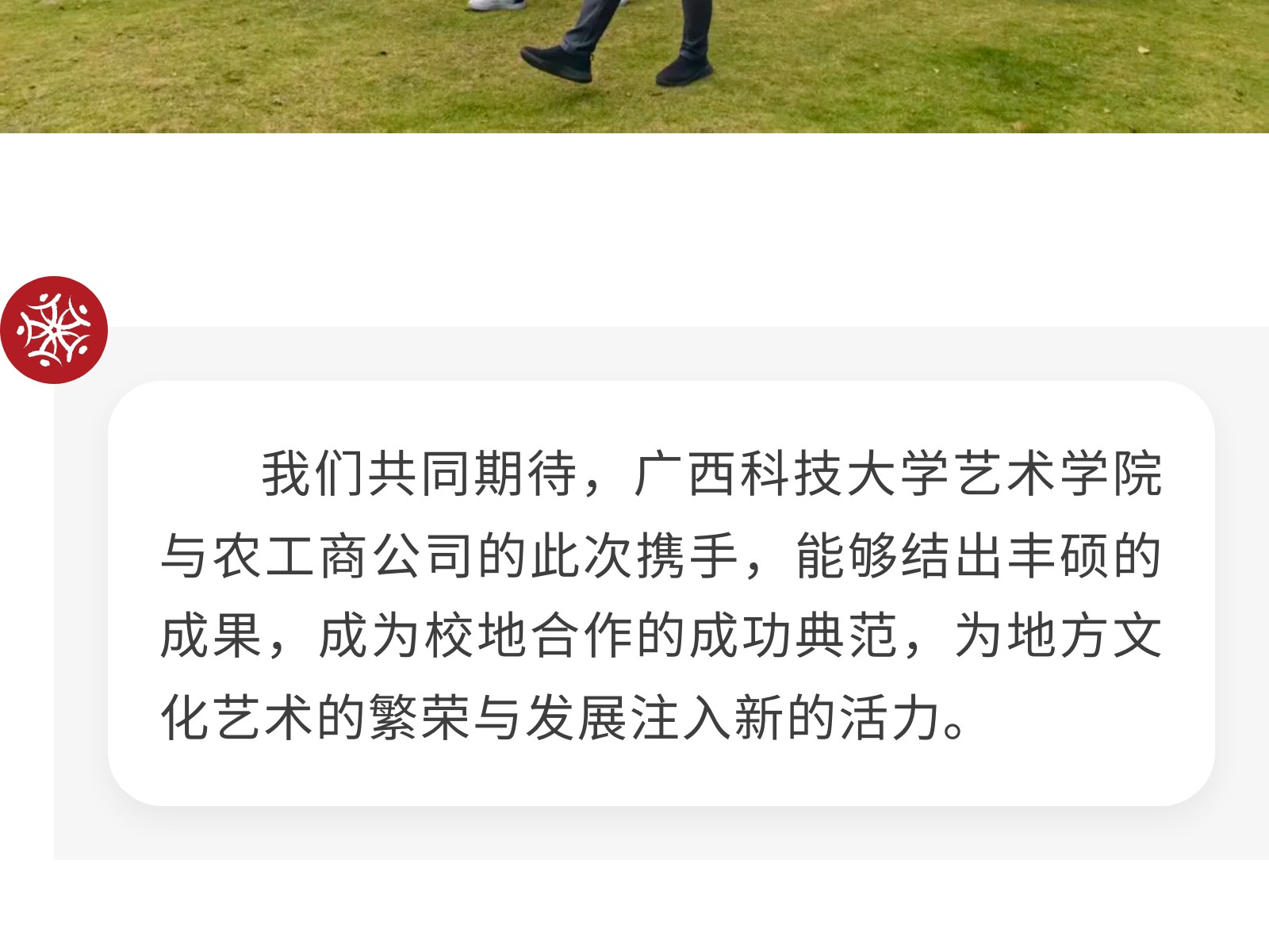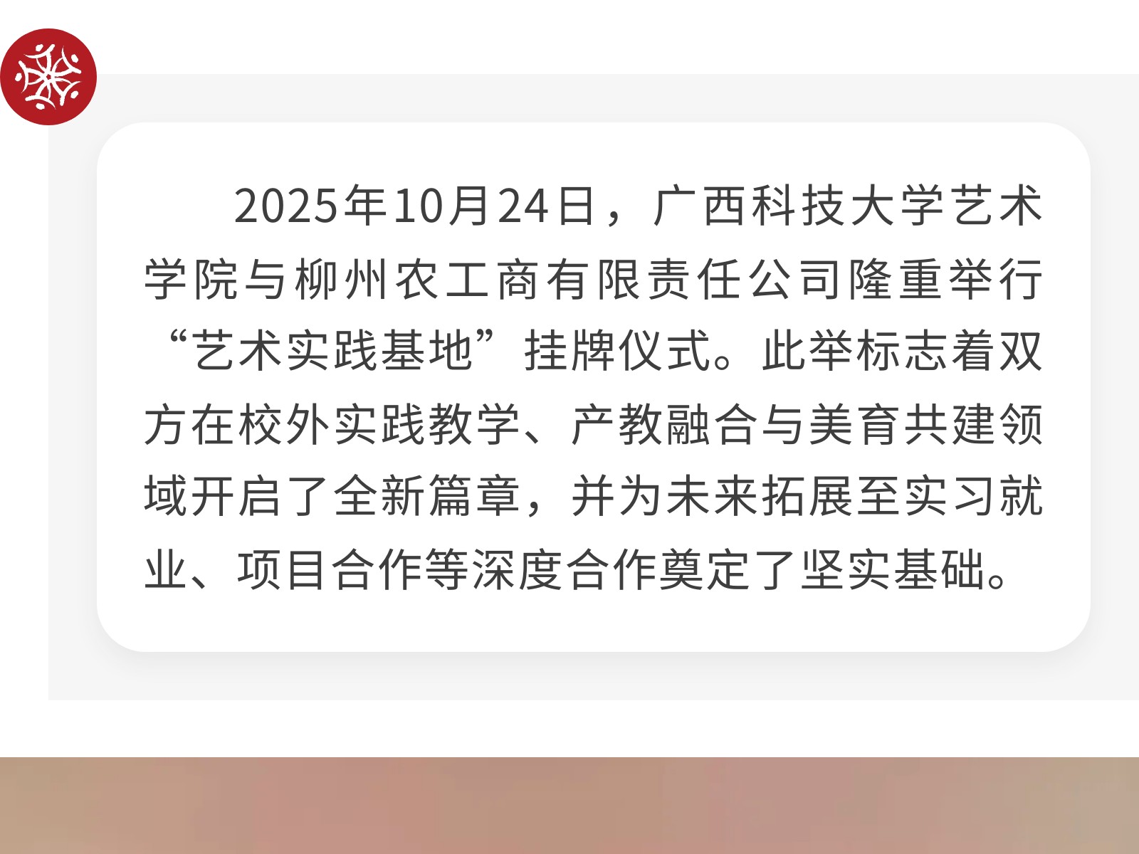 【校企攜手 共育英才】廣西科技大學藝術學院與柳州農(nóng)工商公司正式簽署校企合作協(xié)議 發(fā)布時間:2025年11月02日 10時來源:本站原創(chuàng)瀏覽:42 人次