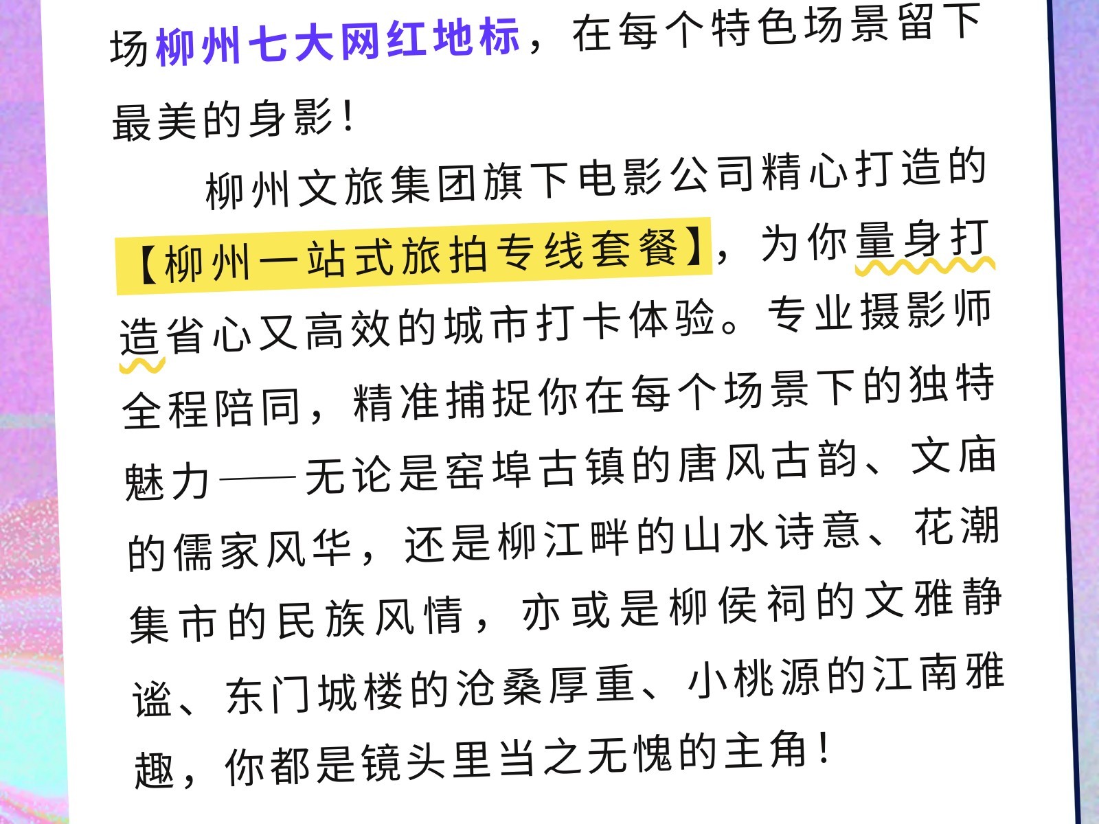 文旅集團(tuán)電影公司創(chuàng)新打造獨(dú)家旅拍專線!穿越柳州絕美打卡點(diǎn),定制你的專屬城市旅行大片! 發(fā)布時(shí)間:2025年11月05日 10時(shí)來源:本站原創(chuàng)瀏覽:46 人次