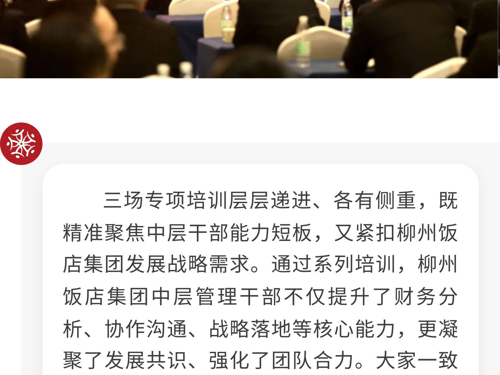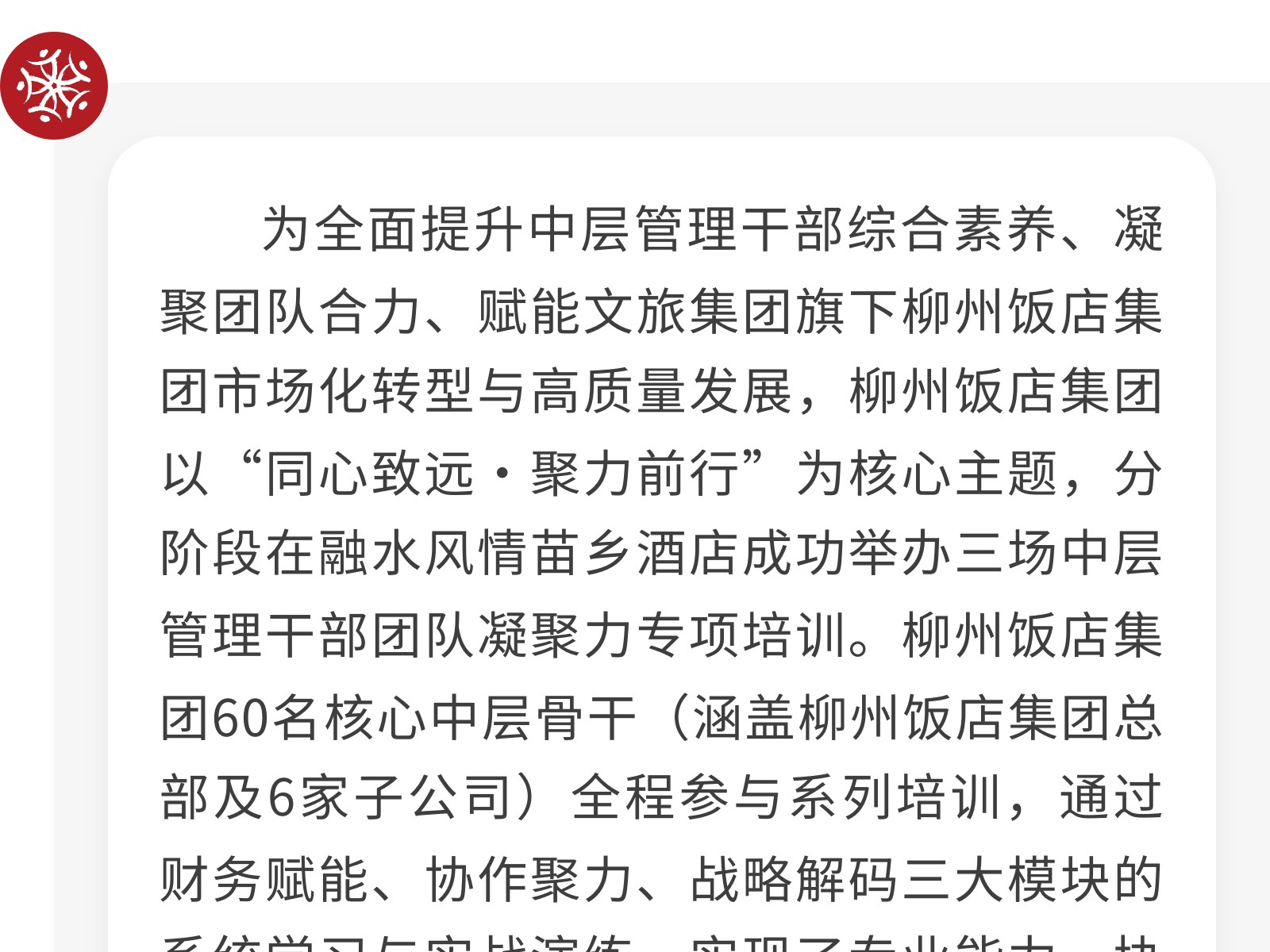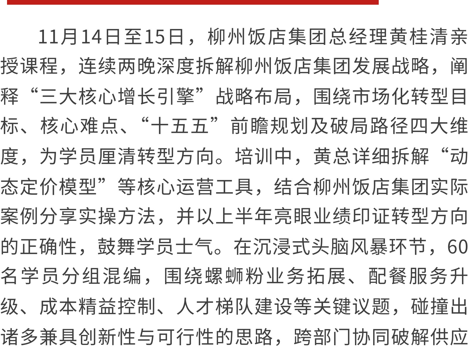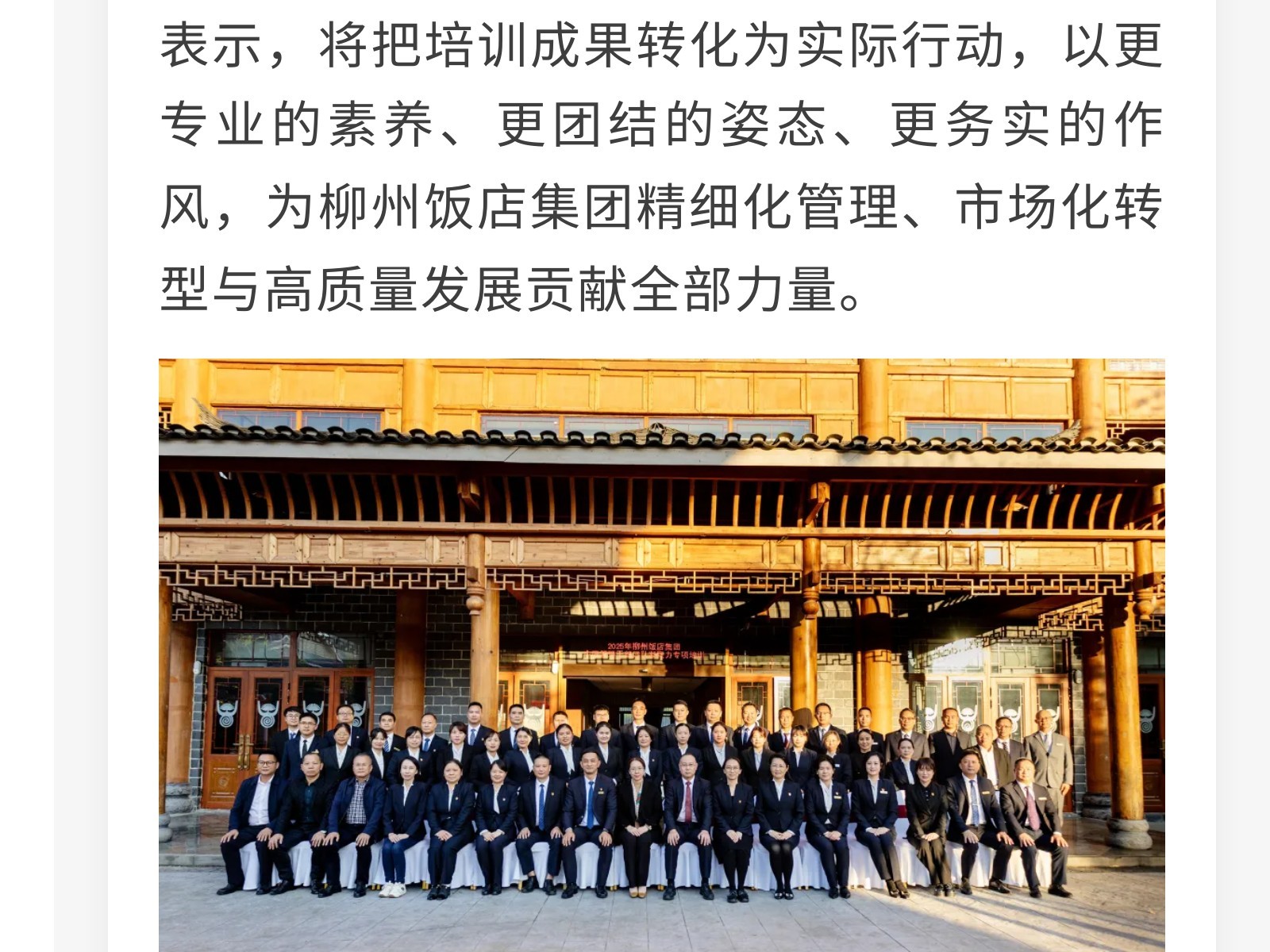 【同心致遠(yuǎn),聚力前行】柳州飯店集團(tuán)中層管理干部團(tuán)隊凝聚力系列專項培訓(xùn)圓滿收官 發(fā)布時間:2025年12月01日 09時來源:本站原創(chuàng)瀏覽:36 人次