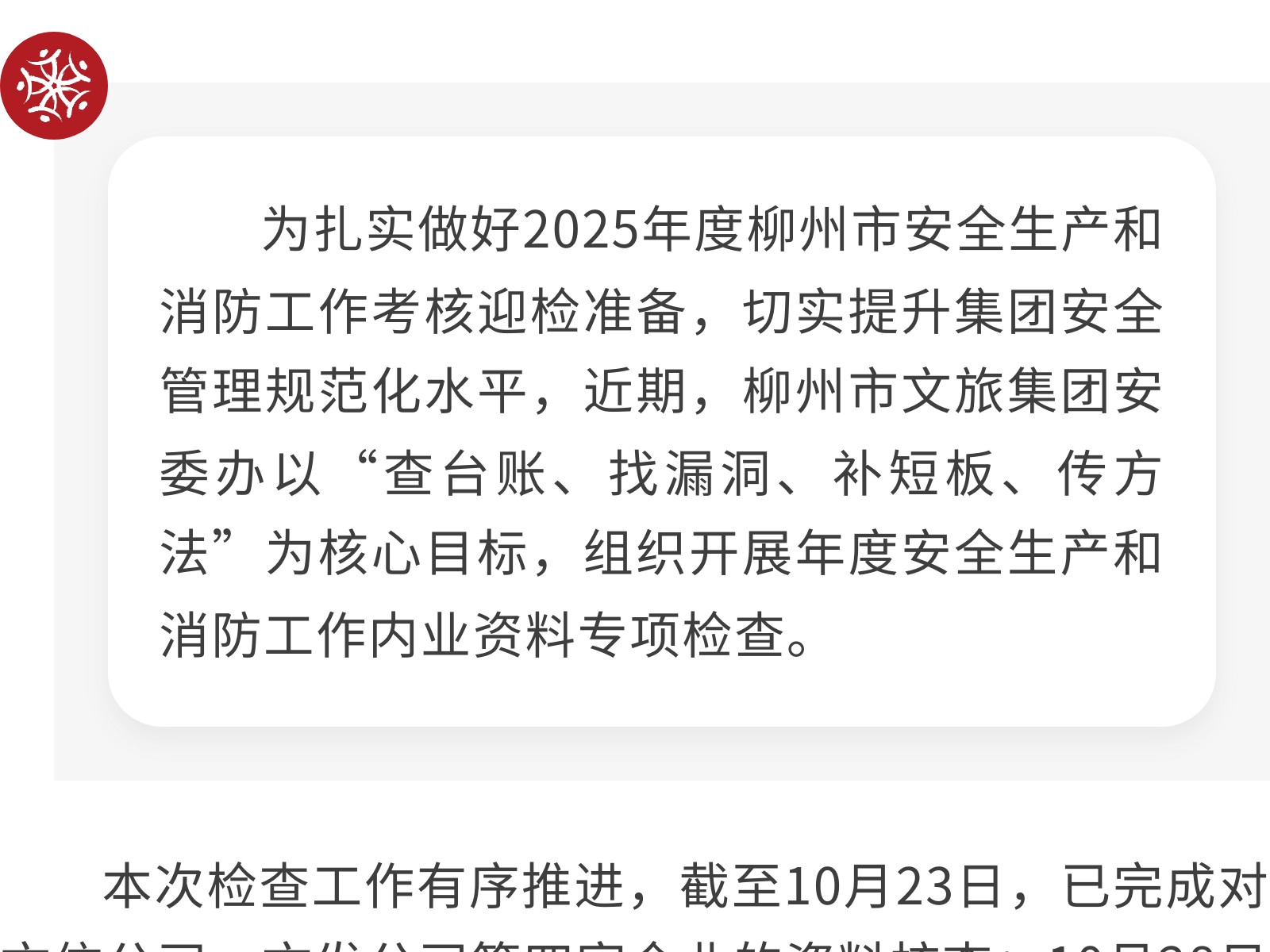 專項(xiàng)檢查安全內(nèi)業(yè)資料 以查促改筑牢安全防線 發(fā)布時(shí)間:2025年12月01日 10時(shí)來(lái)源:本站原創(chuàng)瀏覽:34 人次