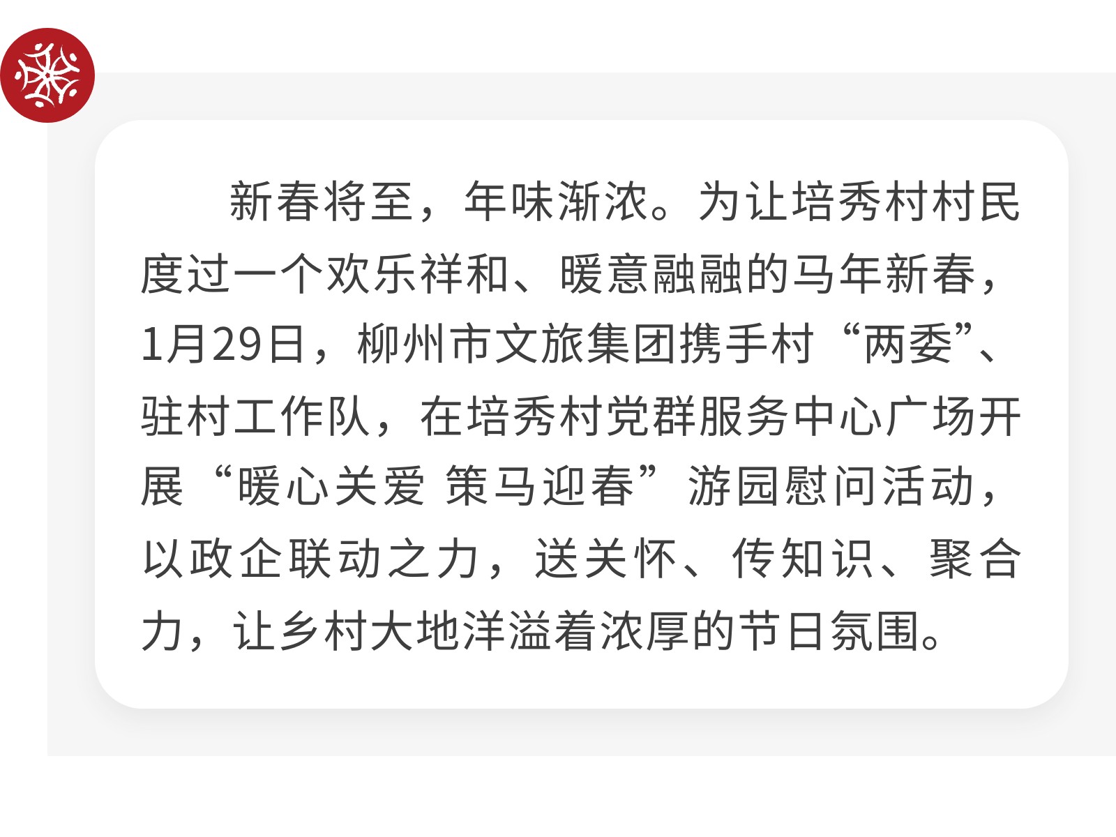 【鄉(xiāng)村振興】聯(lián)動(dòng)暖新春,鄉(xiāng)村共歡樂——柳州市文旅集團(tuán)赴培秀村開展慰問及游園活動(dòng) 發(fā)布時(shí)間:2026年02月03日 15時(shí)來源:本站原創(chuàng)瀏覽:18 人次