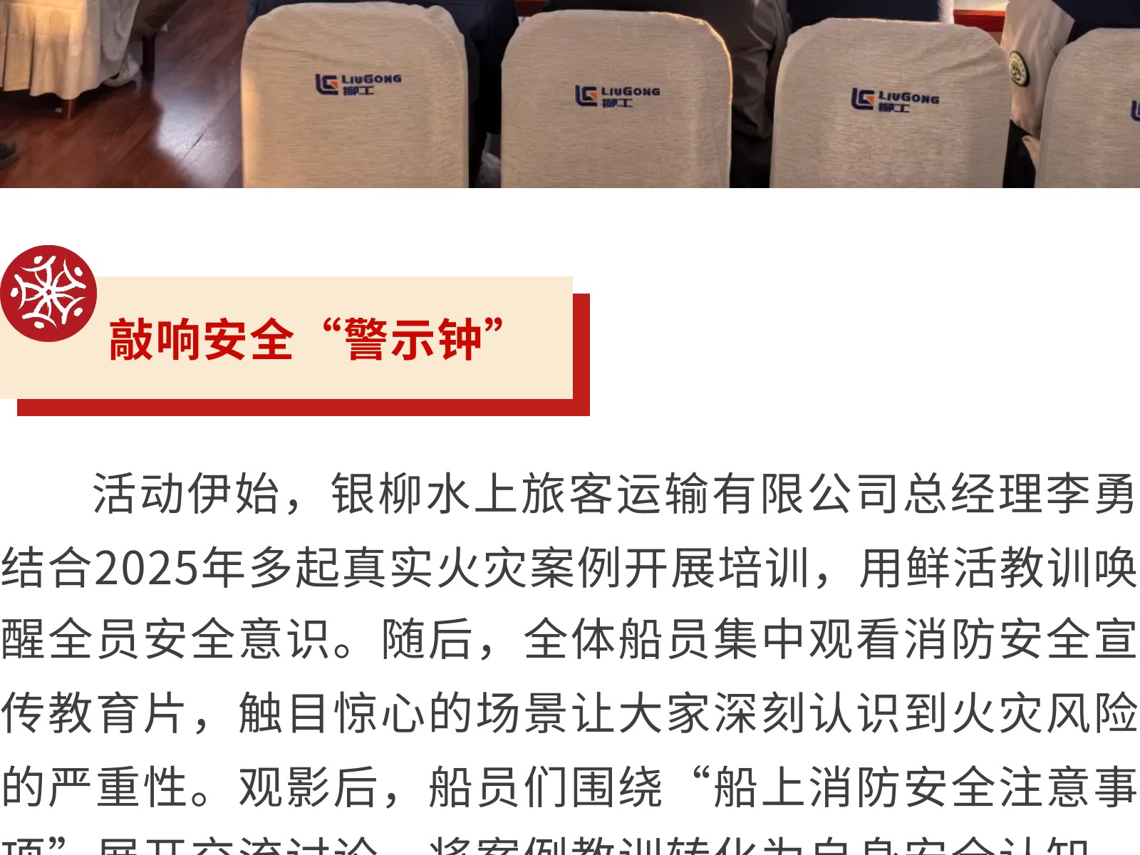 【強(qiáng)化船上消防,守護(hù)航行安全】銀柳水上旅客運(yùn)輸有限公司開展消防安全培訓(xùn)活動(dòng) 發(fā)布時(shí)間:2025年12月09日 10時(shí)來(lái)源:本站原創(chuàng)瀏覽:15 人次